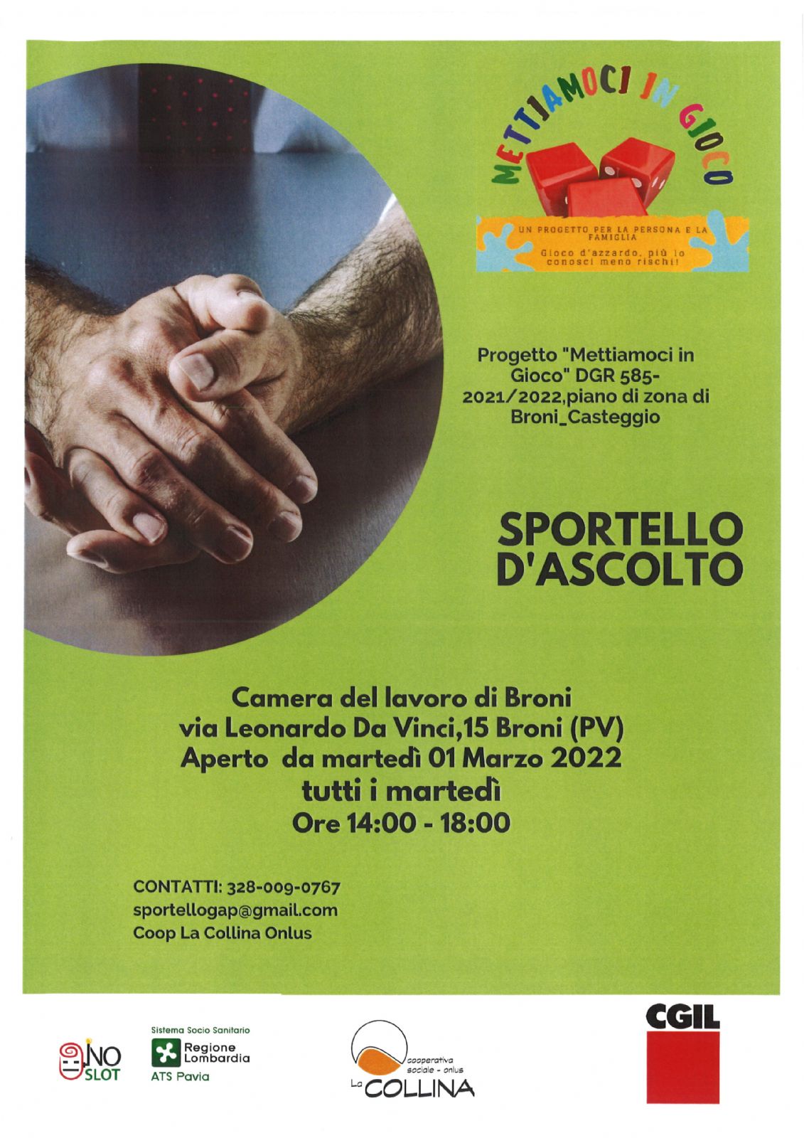 Una delle azioni progettuali riguarda l'attivazione dello "Sportello di ascolto gioco d'azzardo patologico", gestito dalla Fondazione Caritas , quale partner progettuale, che si declinerà nel modo seguente: