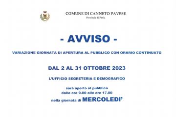 L'Ufficio Segreteria e Demografico dal 2 al 31 ottobre 2023 sarà aperto al pubblico con orario continuato dalle ore 9.00 alle ore 17.00 nella...