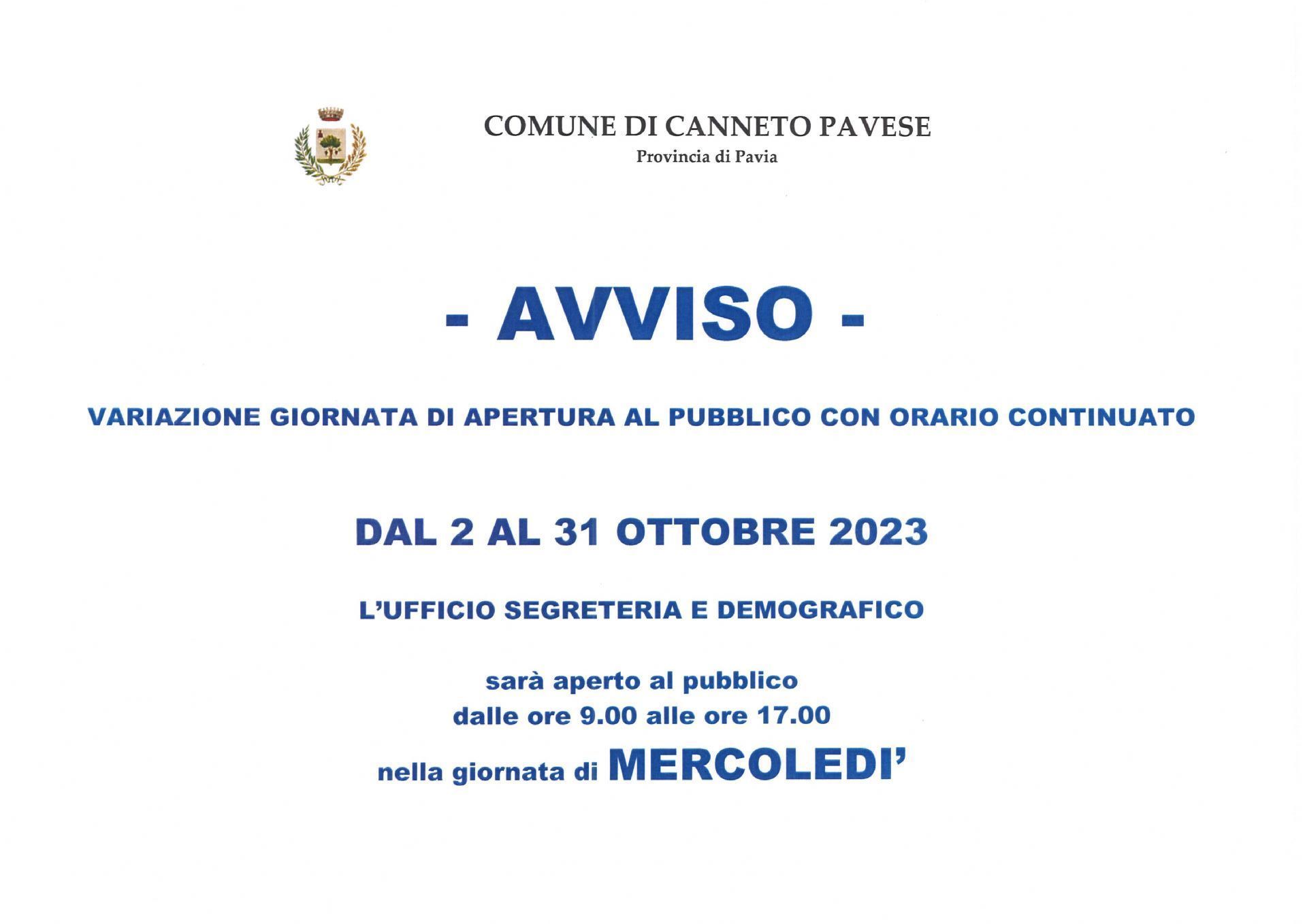L'Ufficio Segreteria e Demografico dal 2 al 31 ottobre 2023 sarà aperto al pubblico con orario continuato dalle ore 9.00 alle ore 17.00 nella giornata di Mercoledì