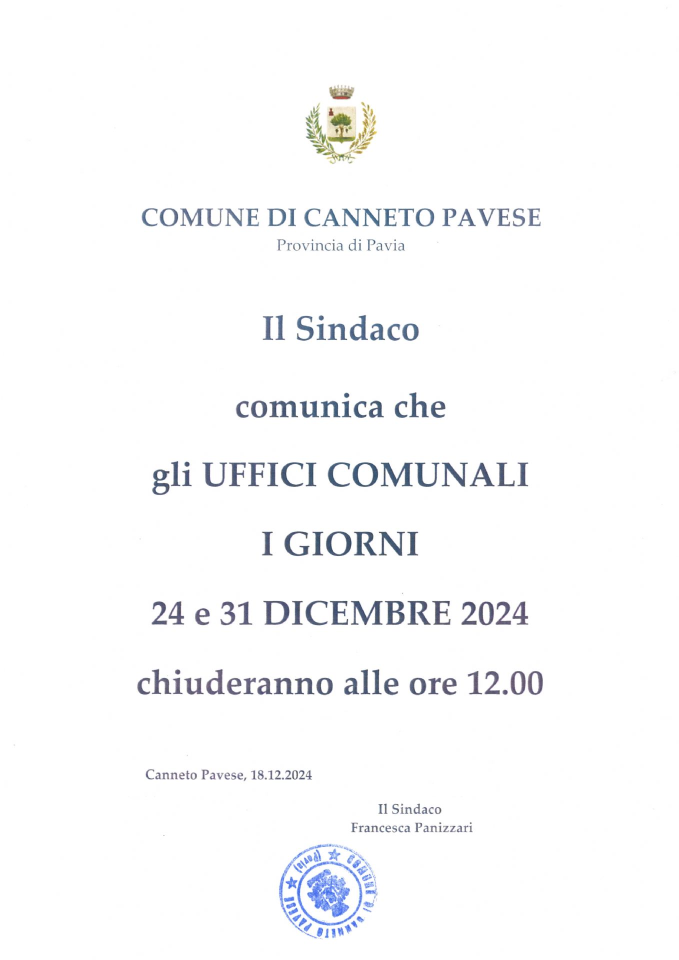 Chiusura anticipata degli Uffici Comunali il 24 e il 31 dicembre 2024