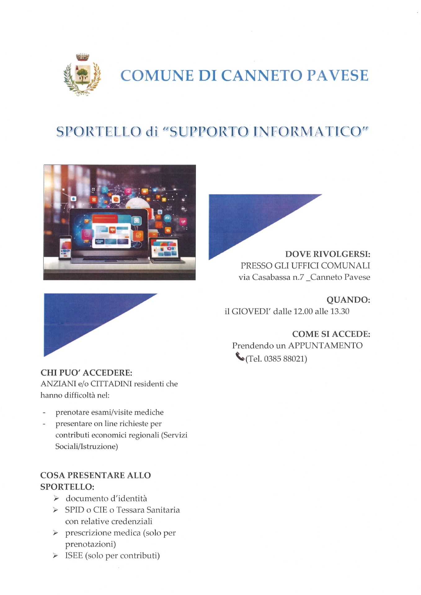 Lo Sportello è accessibile presso gli Uffici Comunali il GIOVEDI' dalle ore 12.00 alle ore 13.30 solo su APPUNTAMENTO.