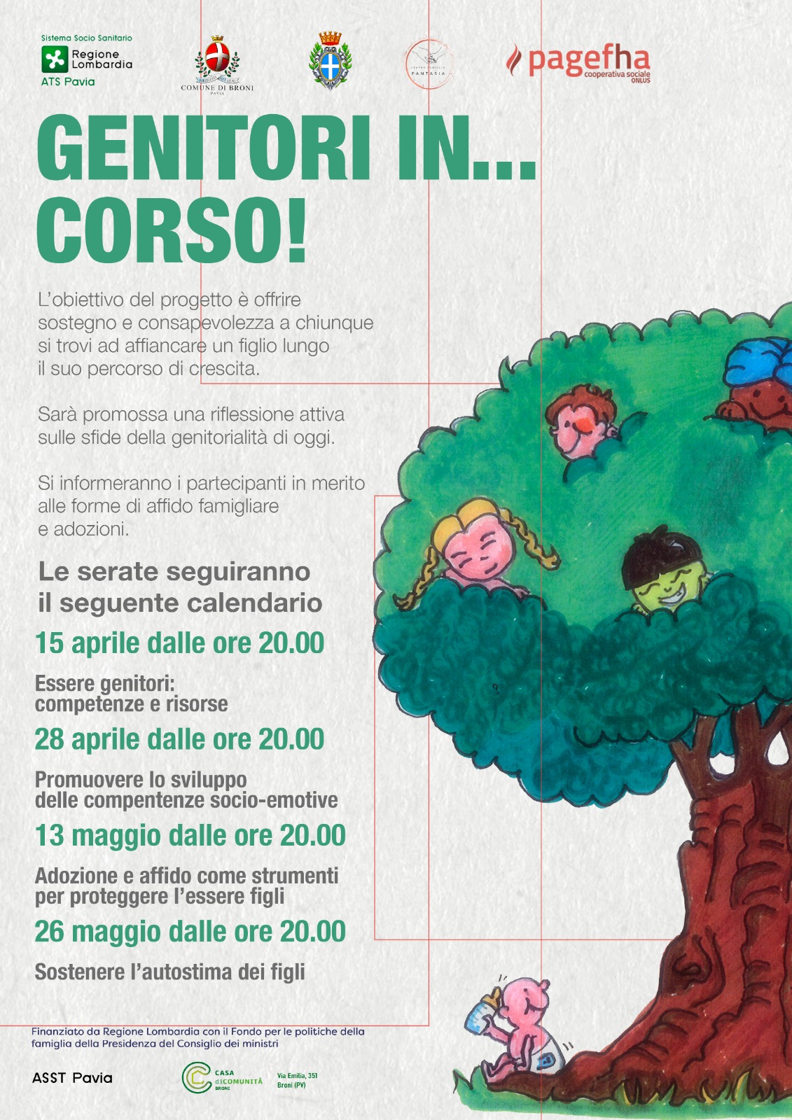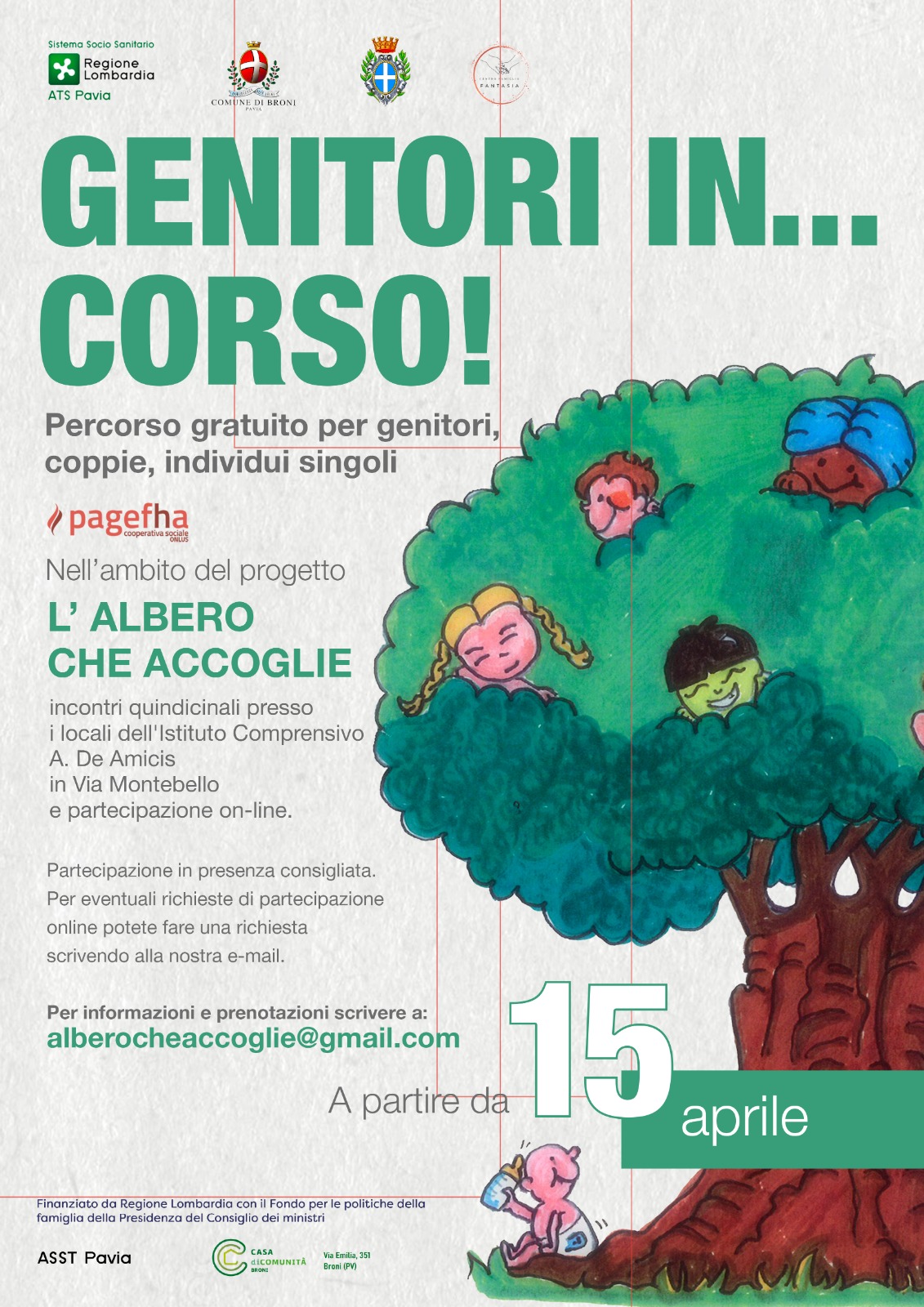 Il progetto “l’Albero che Accoglie/ Genitori in Corsa” prevede incontri quindicinali gratuiti per genitori, coppie e individui singoli, con l’obiettivo di fornire sostegno e consapevolezza a chiunque si trovi ad affiancare