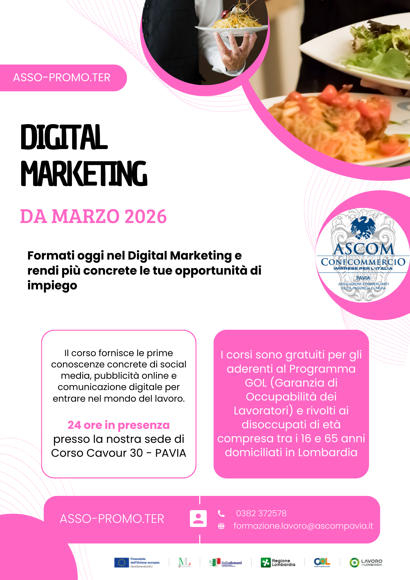 Si condividono le locandine informative dei vari corsi organizzati ed in partenza presso ASSO-PRO.MOTER a Pavia, nell'ambito del programma GOL (Garanzia di Occupabilità dei Lavoratori); i corsi sono gratuiti per le persone disoccupate aderenti al programma GOL , e sono rivolti a persone di età compresa tra i 16 ed i 65 anni domiciliate in Lombardia.