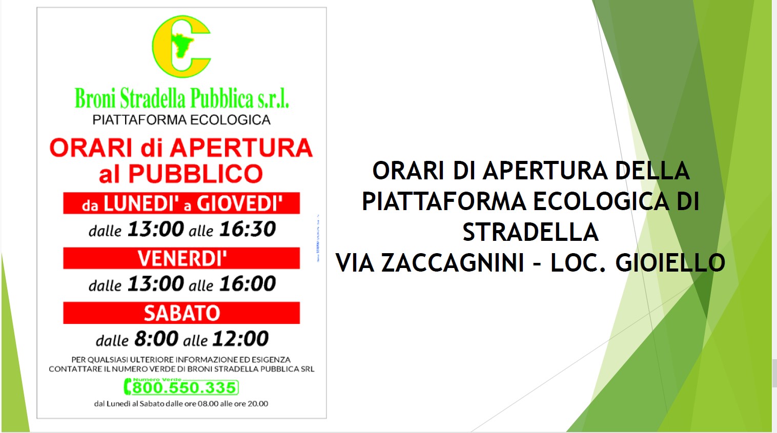 E' possibile in alternativa fruire della PIATTAFORMA ECOLOGICA di Stradella, Loc. Gioiello, Via Zaccagnini, secondo giorni e orari specificati nella locandina.