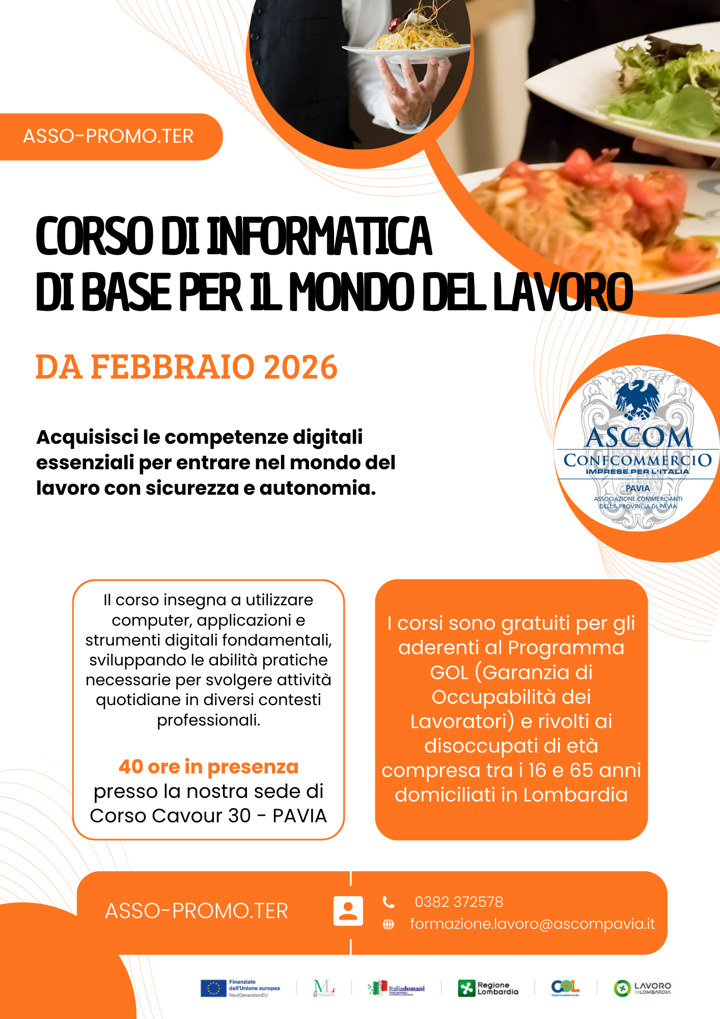 Si condividono le locandine informative dei vari corsi organizzati ed in partenza presso ASSO-PRO.MOTER a Pavia, nell'ambito del programma GOL (Garanzia di Occupabilità dei Lavoratori); i corsi sono gratuiti per le persone disoccupate aderenti al programma GOL , e sono rivolti a persone di età compresa tra i 16 ed i 65 anni domiciliate in Lombardia.