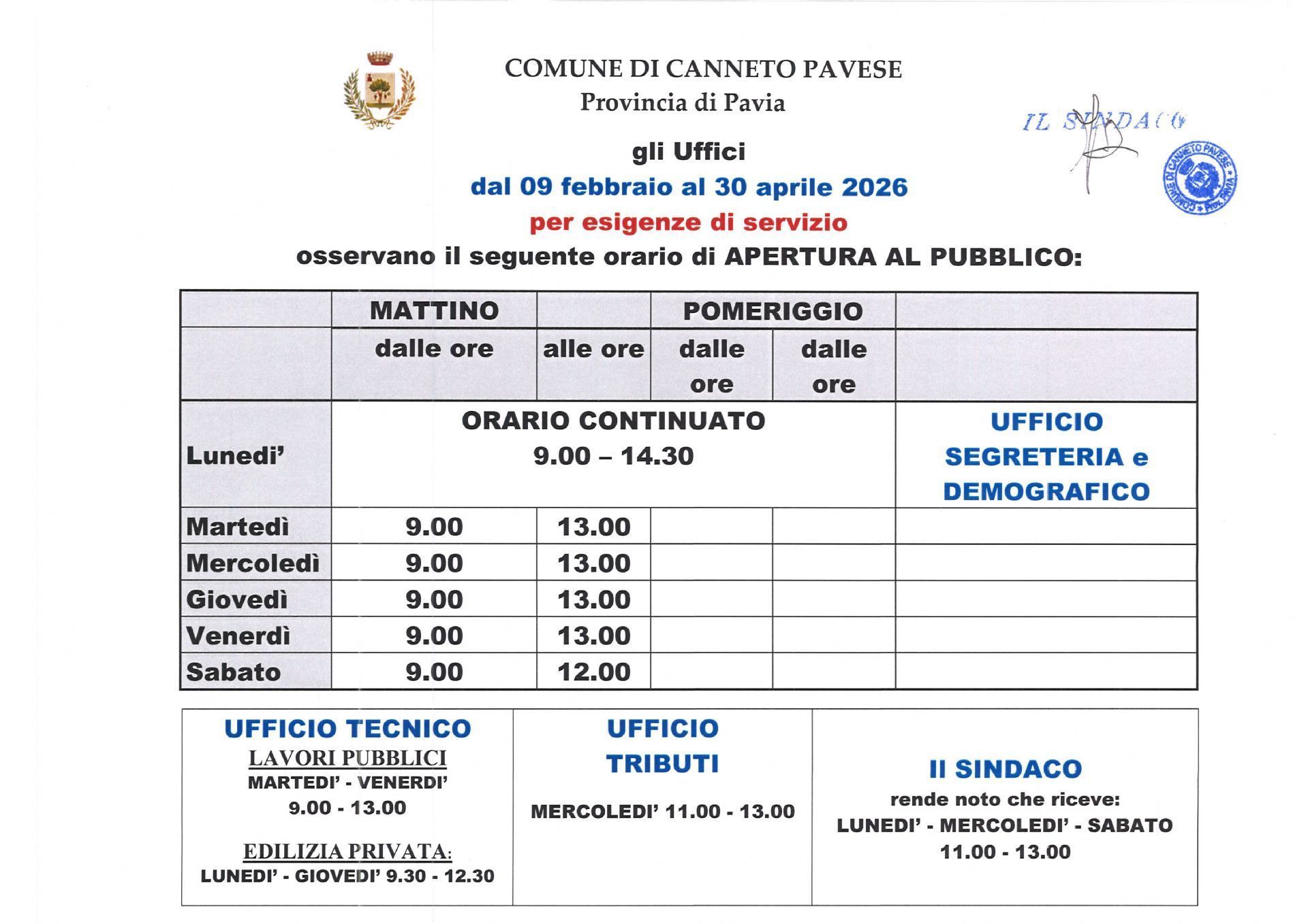 Nuovo orario di apertura al pubblico degli uffici comunali dal 09/02/2026 al 30/04/2026